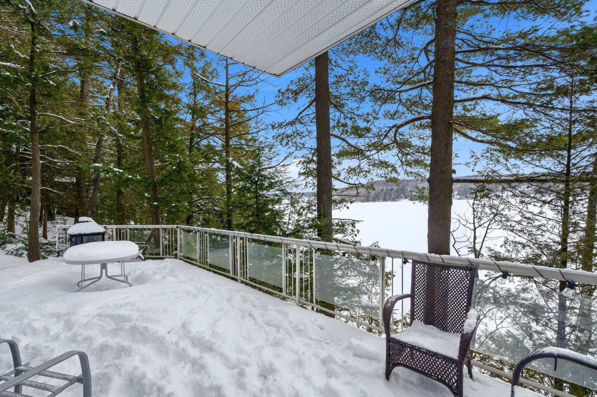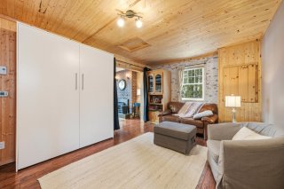 Le rez-de-chaussée comprend également une salle de bain complète, alors que le rez-de-jardin accueille une chambre à coucher confortable. À l'extérieur, la terrasse surplombant le lac invite à profiter pleinement du panorama et de la tranquillité des lieux, dans une intimité totale sans aucun voisin à l'arrière. Le terrain boisé de 14 143 pi² renforce ce sentiment de quiétude.