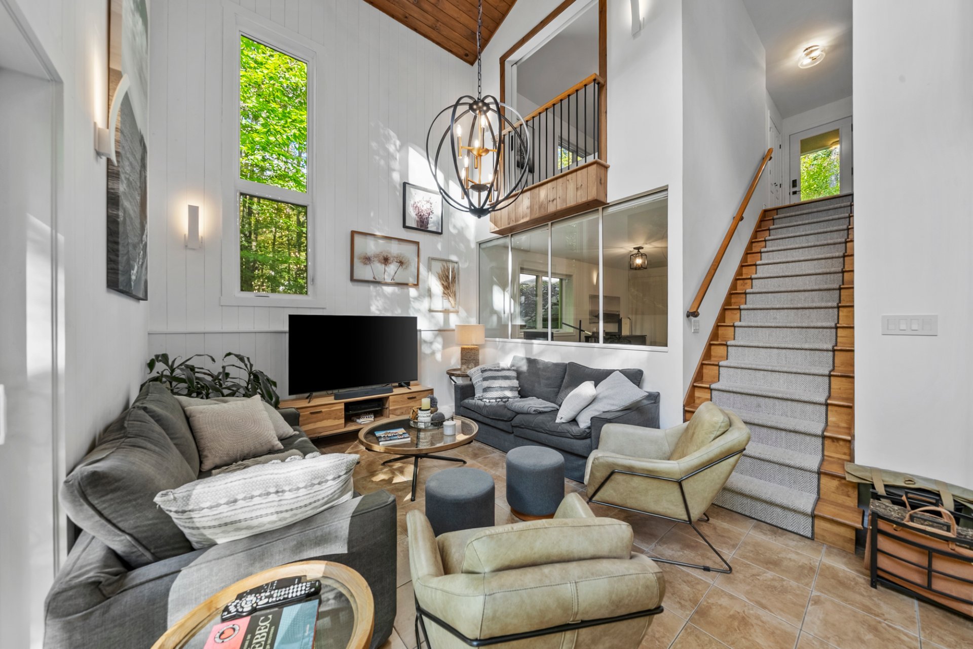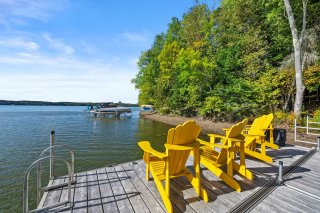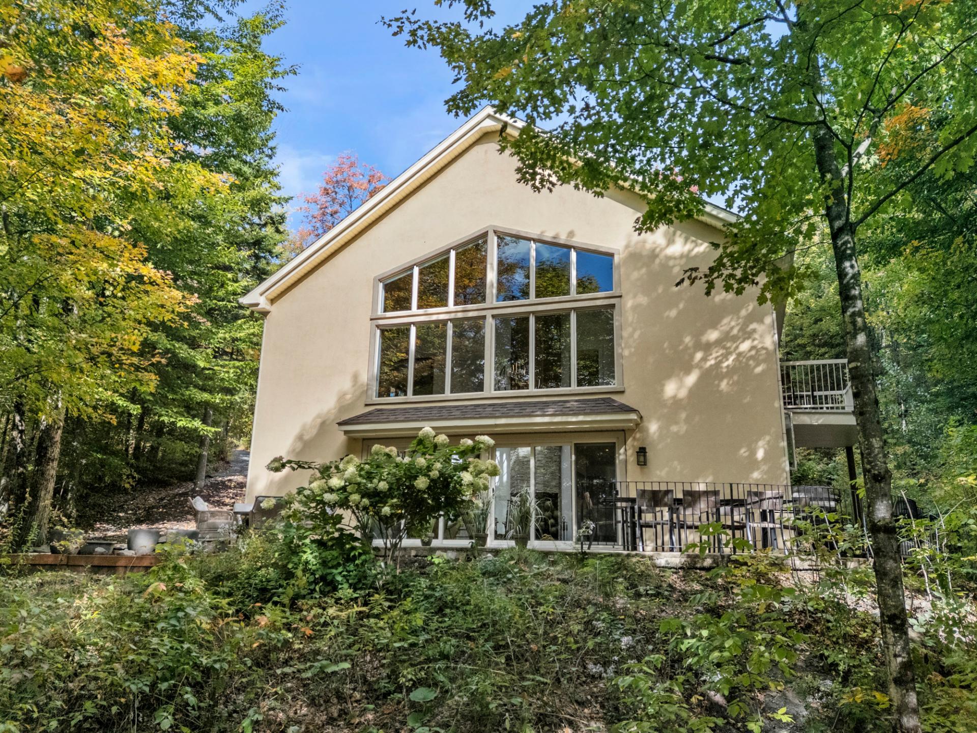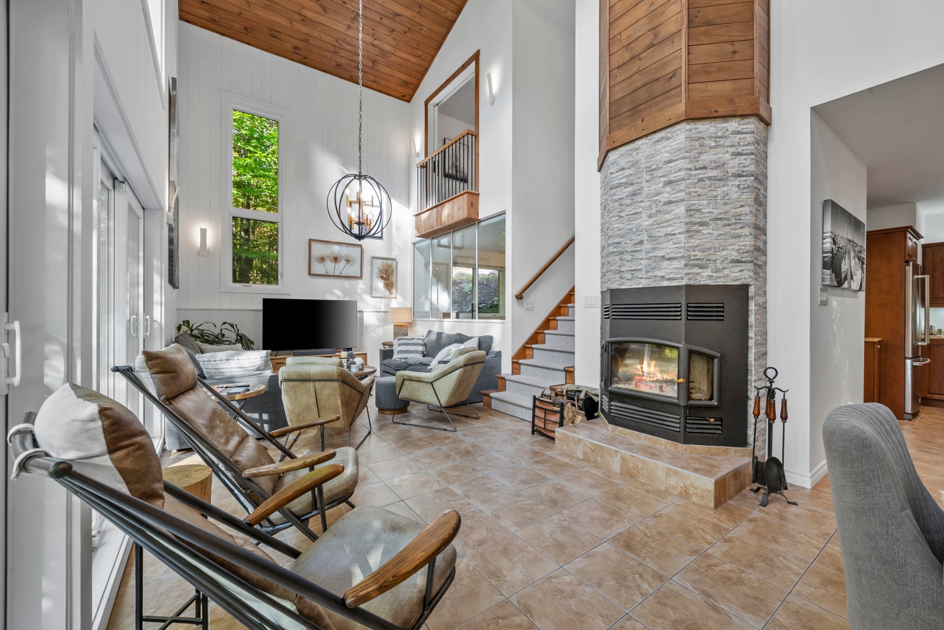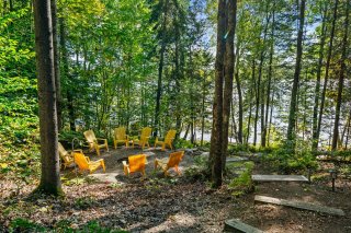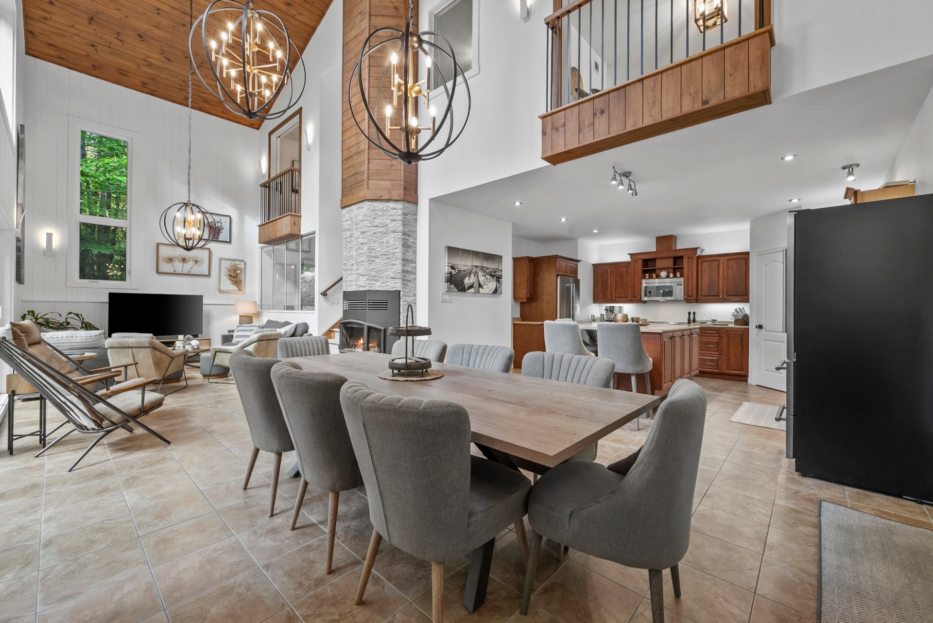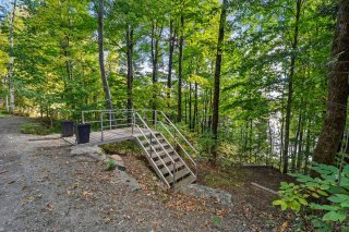 À l'extérieur, terrasses et balcons vous permettent de profiter pleinement du cadre naturel : barbecue sur le patio couvert, café matinal sur le balcon, ou soirée autour du feu avec VUE SUR LE LAC. Un sentier privé mène à un espace aménagé avec chaises Adirondack et foyer, idéal pour les rassemblements en famille ou entre amis.