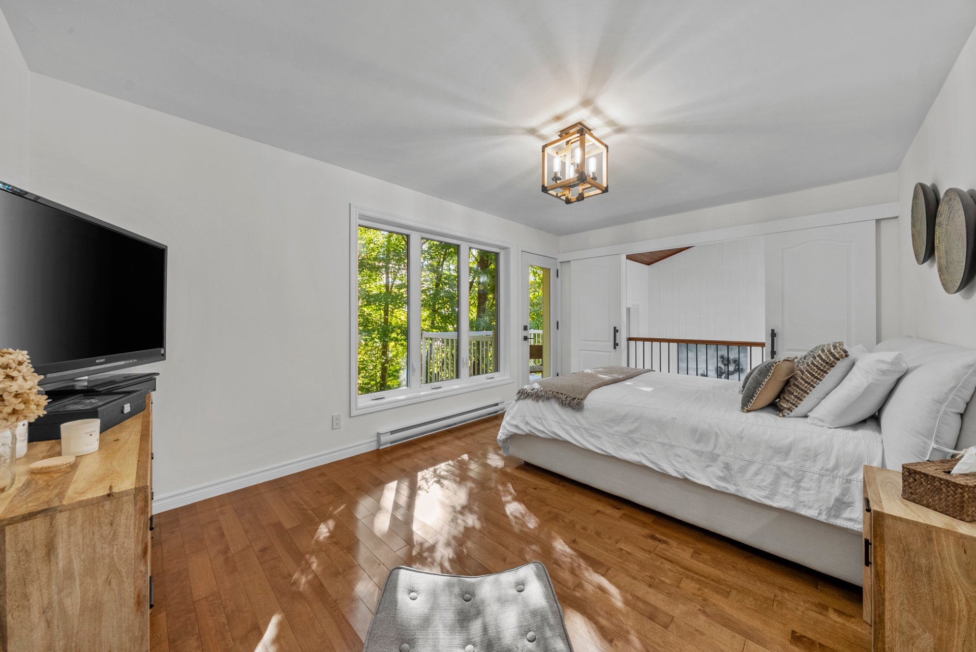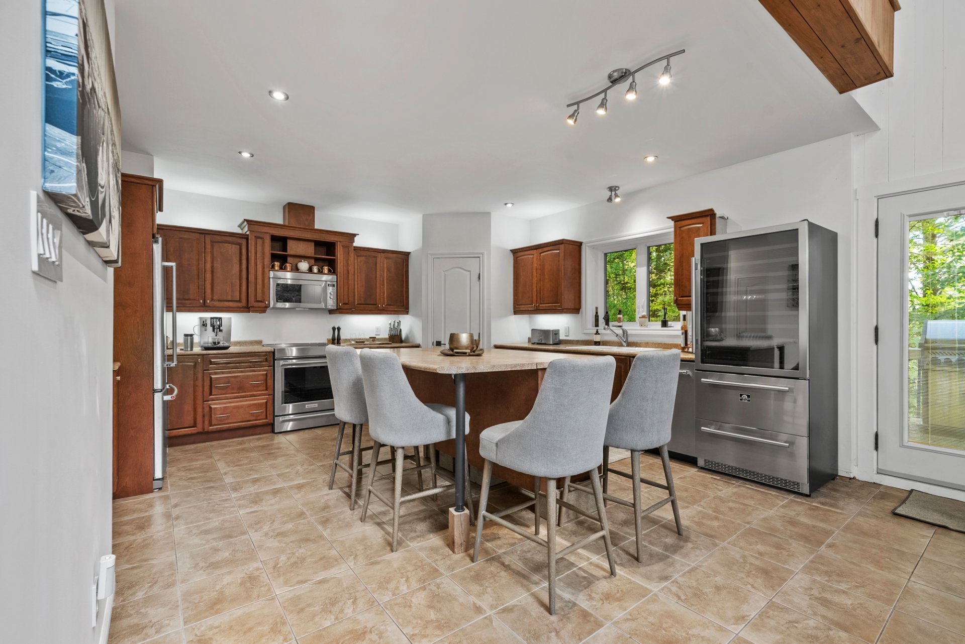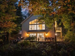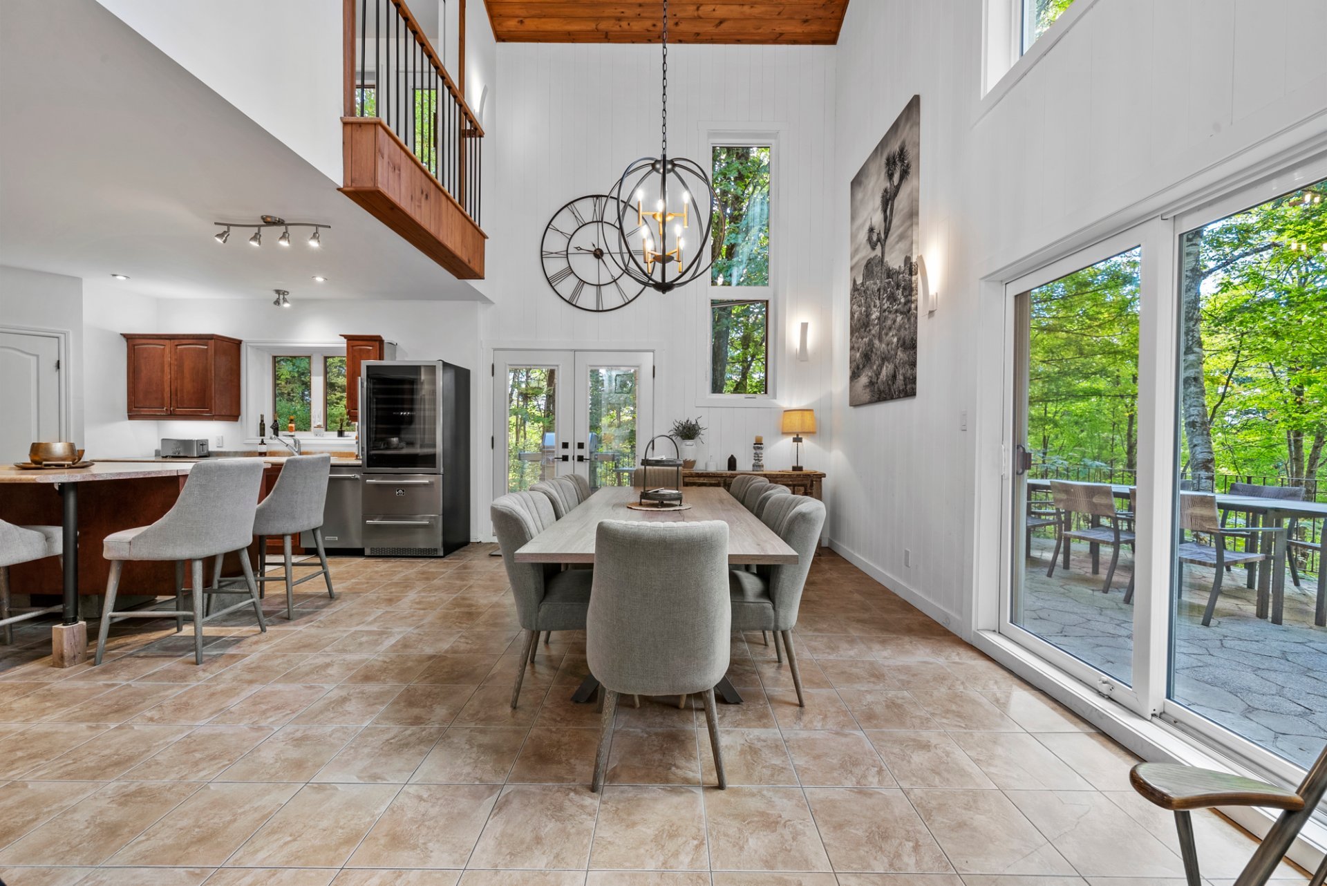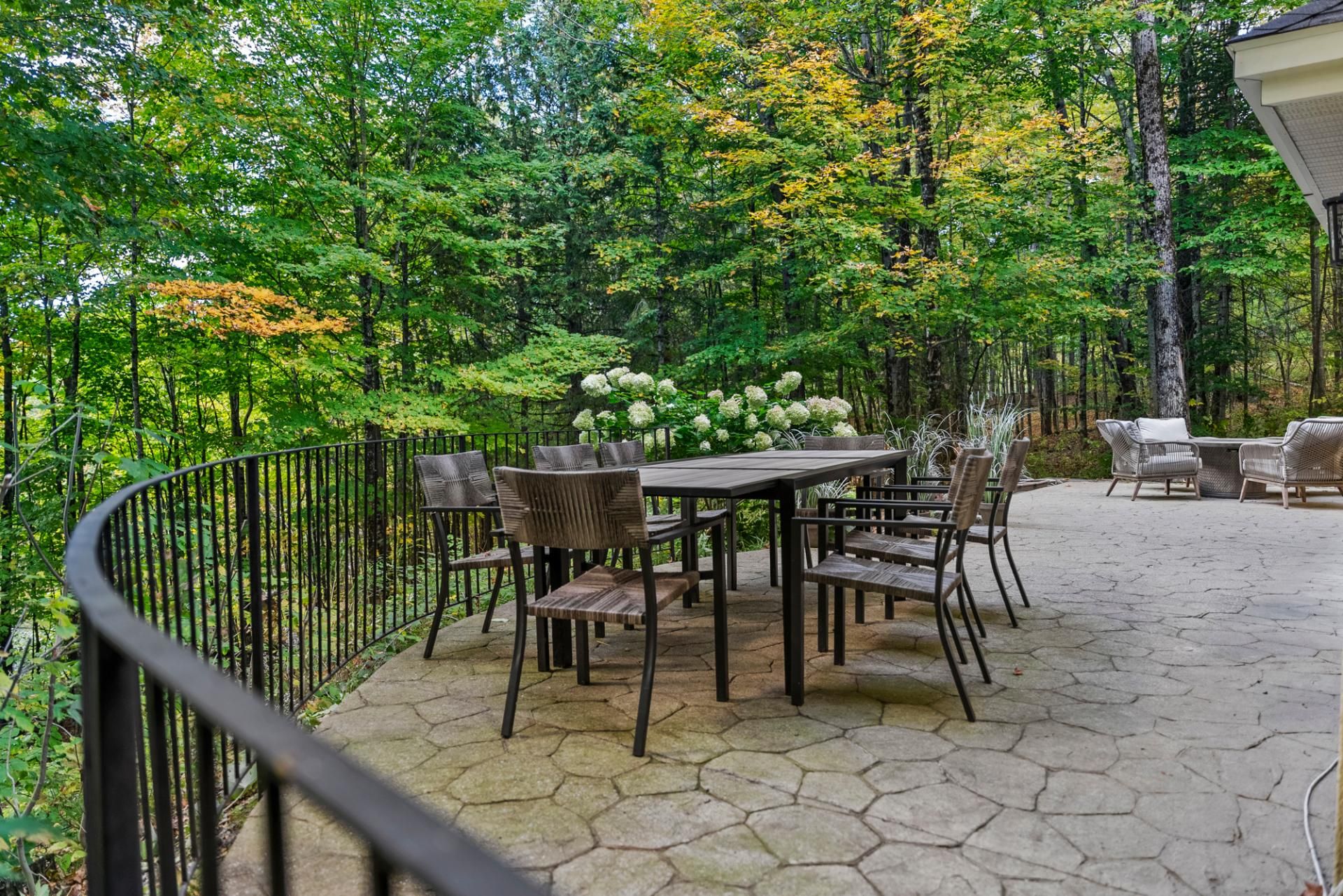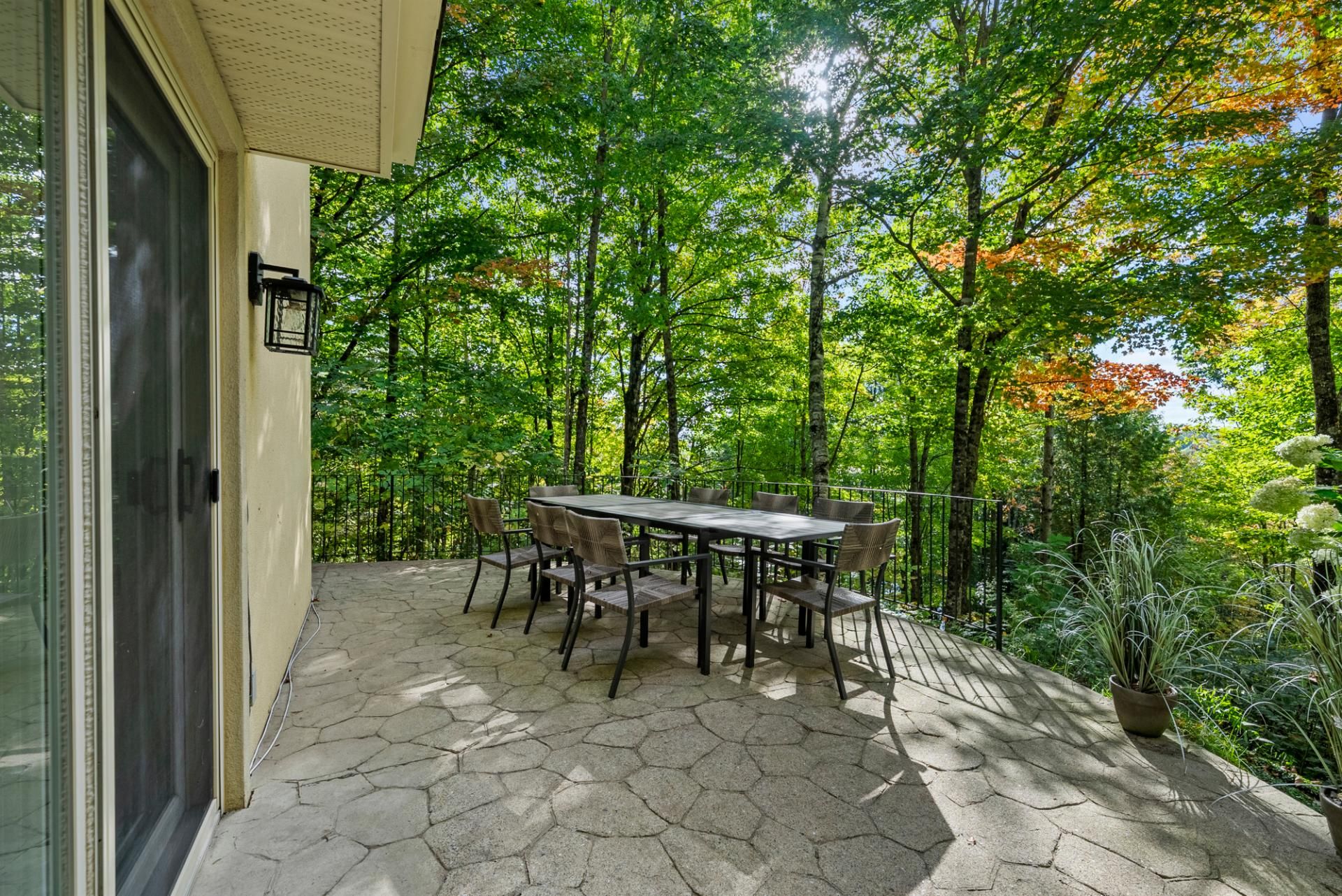 À l'extérieur, terrasses et balcons vous permettent de profiter pleinement du cadre naturel : barbecue sur le patio couvert, café matinal sur le balcon, ou soirée autour du feu avec VUE SUR LE LAC. Un sentier privé mène à un espace aménagé avec chaises Adirondack et foyer, idéal pour les rassemblements en famille ou entre amis.