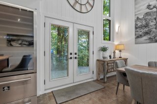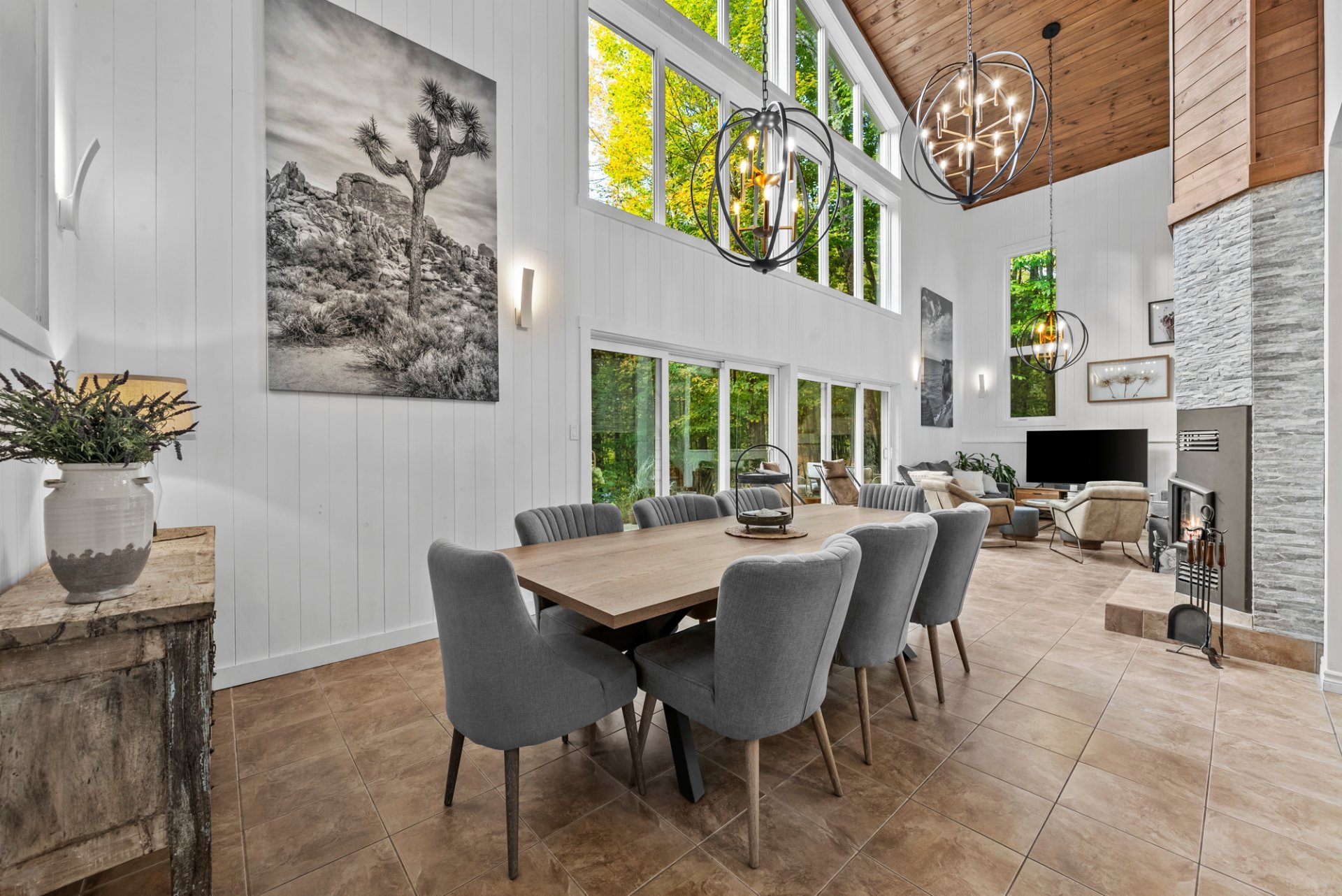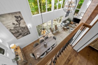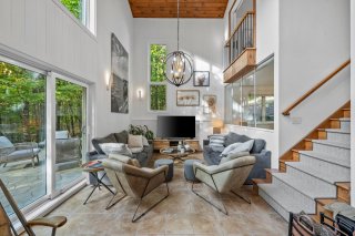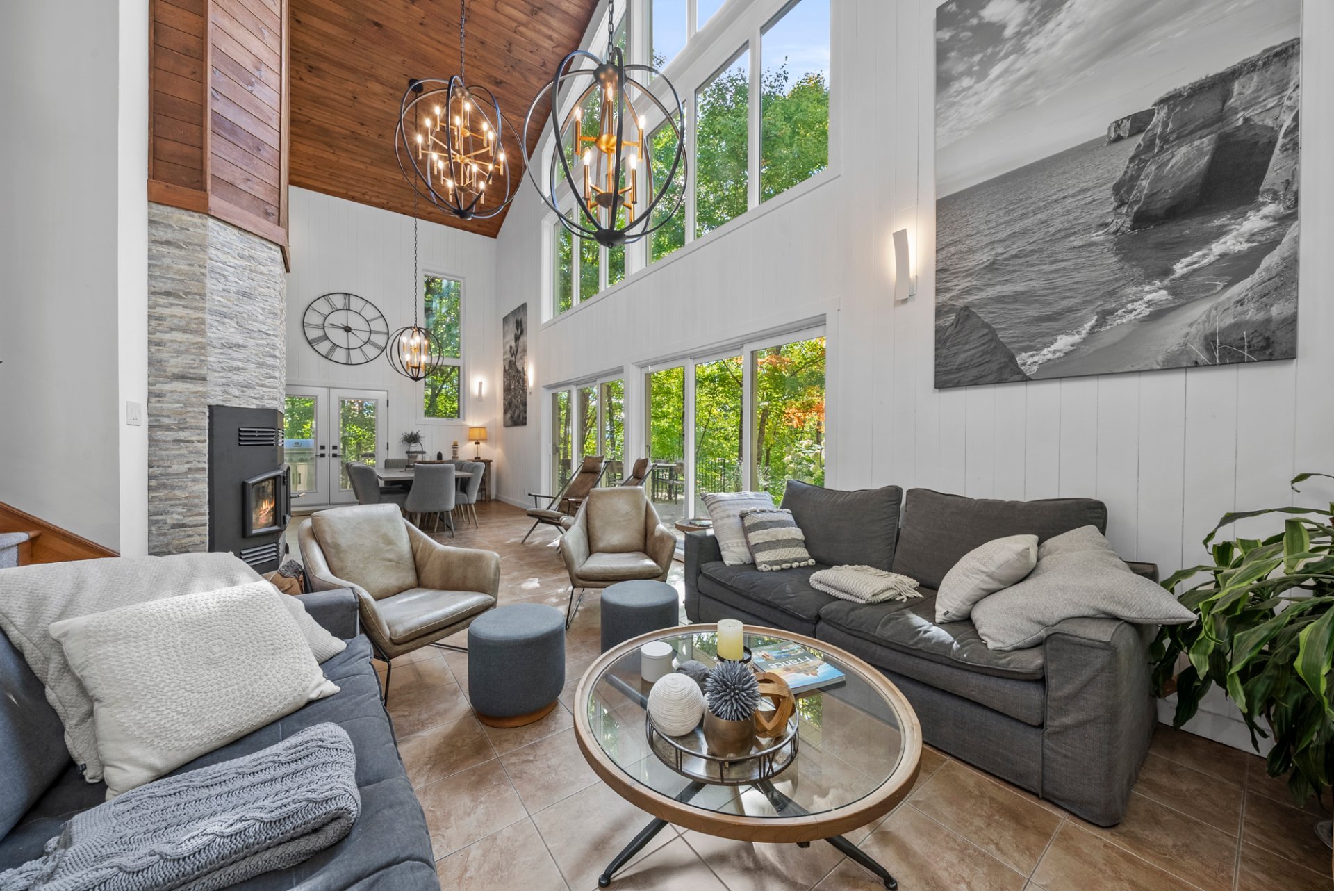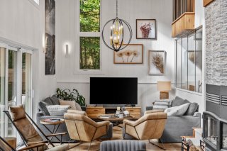 À l'intérieur, chaque pièce a été pensée pour offrir un quotidien empreint de douceur. Le salon à plafond cathédrale, baigné de lumière grâce aux immenses fenêtres, s'ouvre sur une chaleureuse cheminée en pierre, idéale pour les soirées d'automne. La cuisine, spacieuse et conviviale, séduit par ses matériaux nobles, son îlot central et ses vues imprenables sur la forêt environnante. La salle à manger et les espaces de vie communiquent naturellement, créant une atmosphère fluide et accueillante.