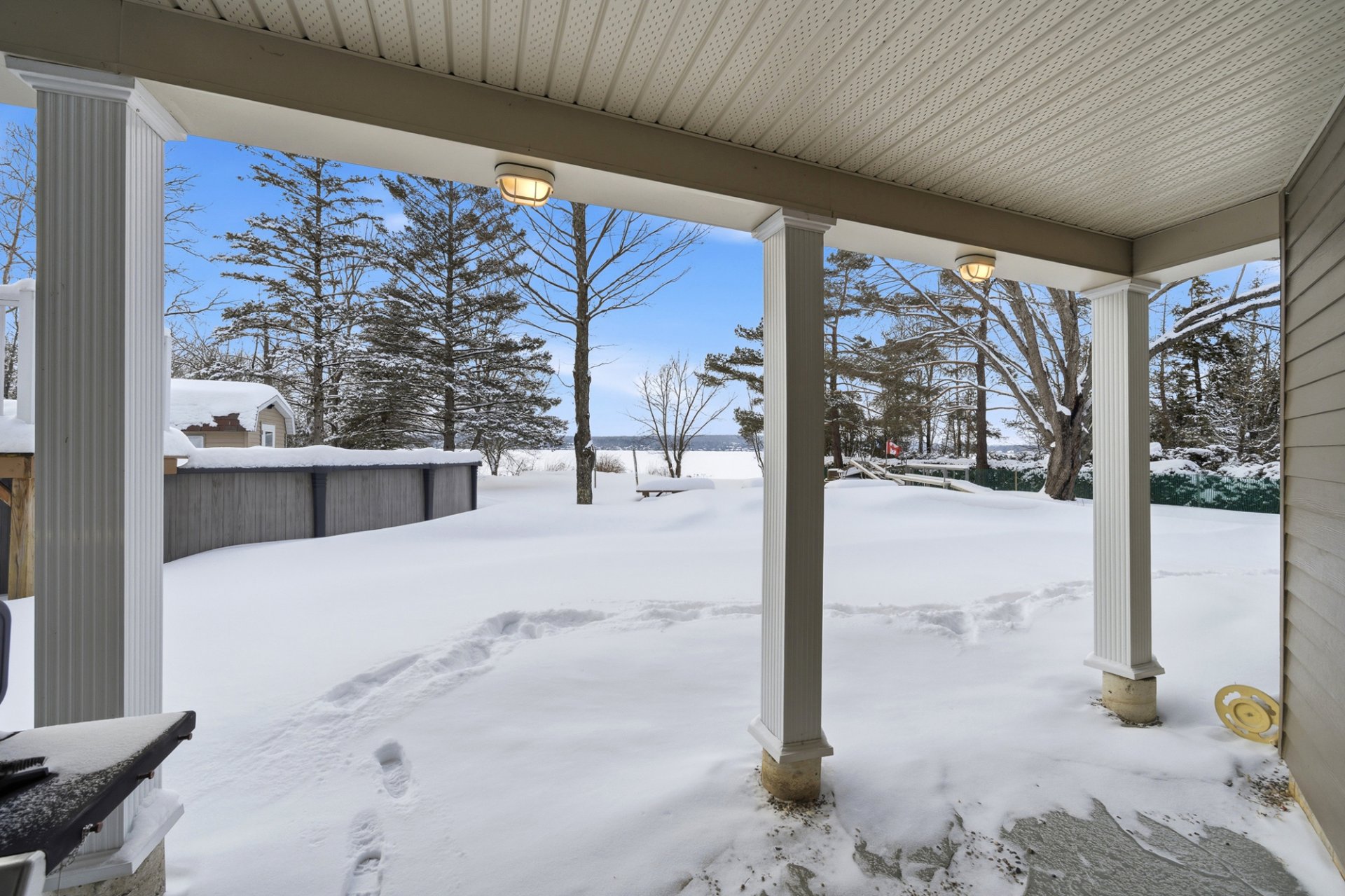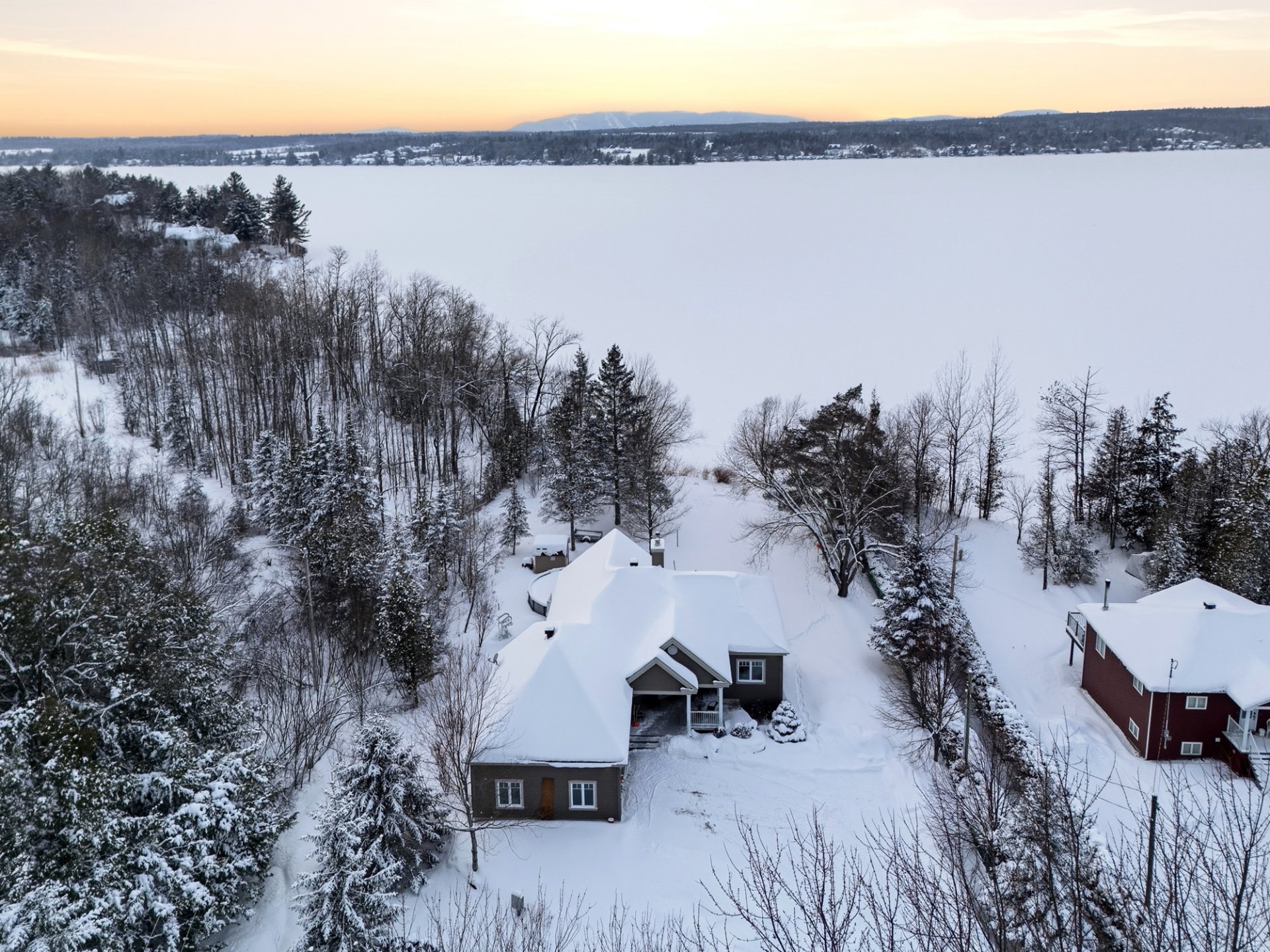À l'extérieur, la cour boisée et intime propose une grande terrasse, une piscine hors terre chauffée et un accès direct au lac Magog, un privilège rare.