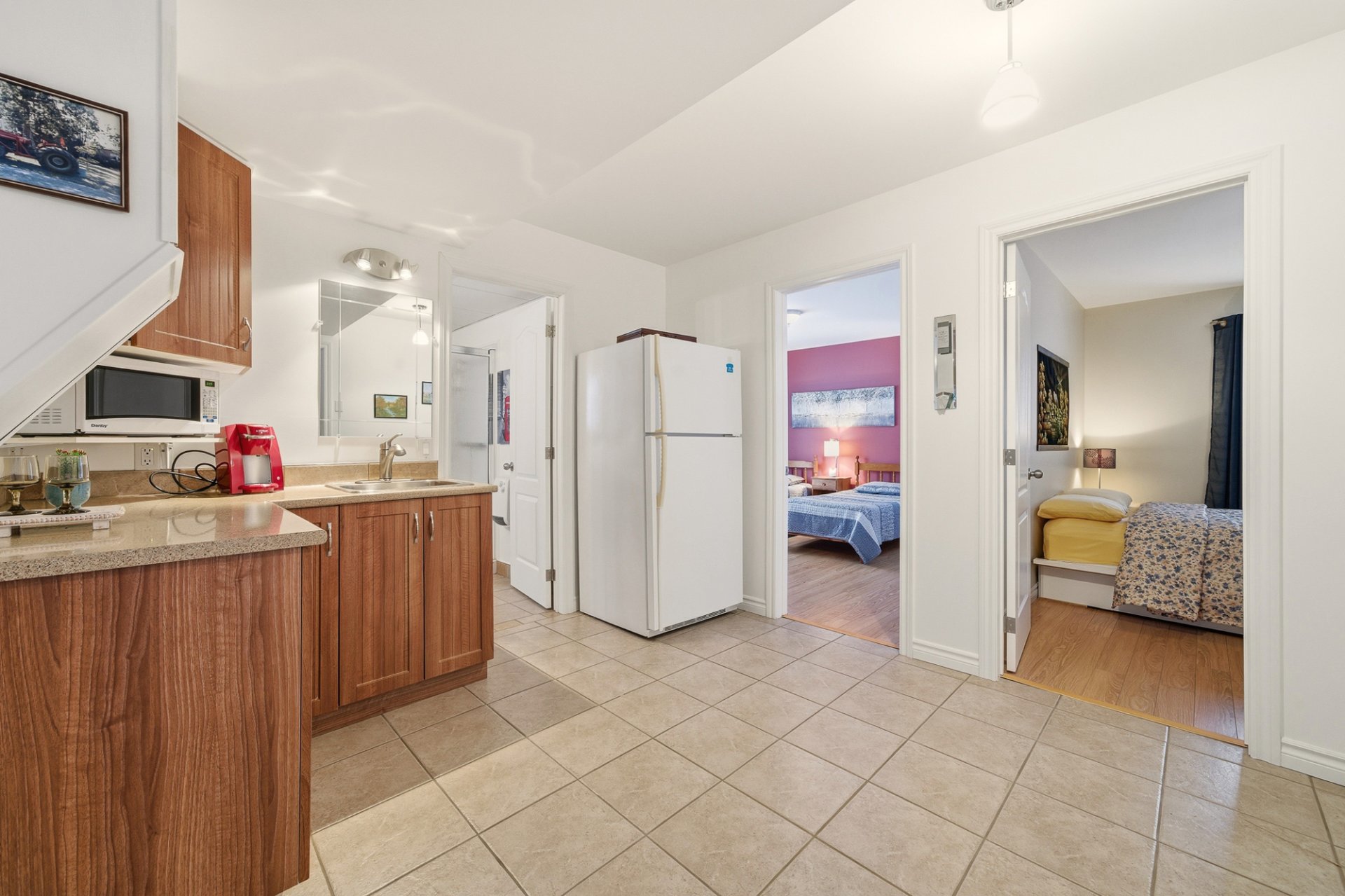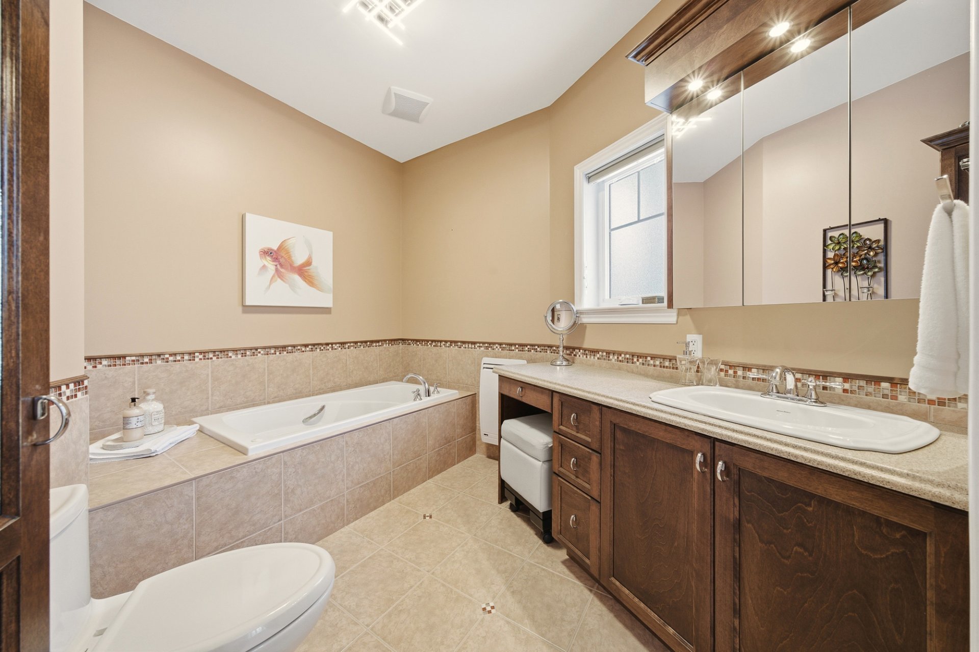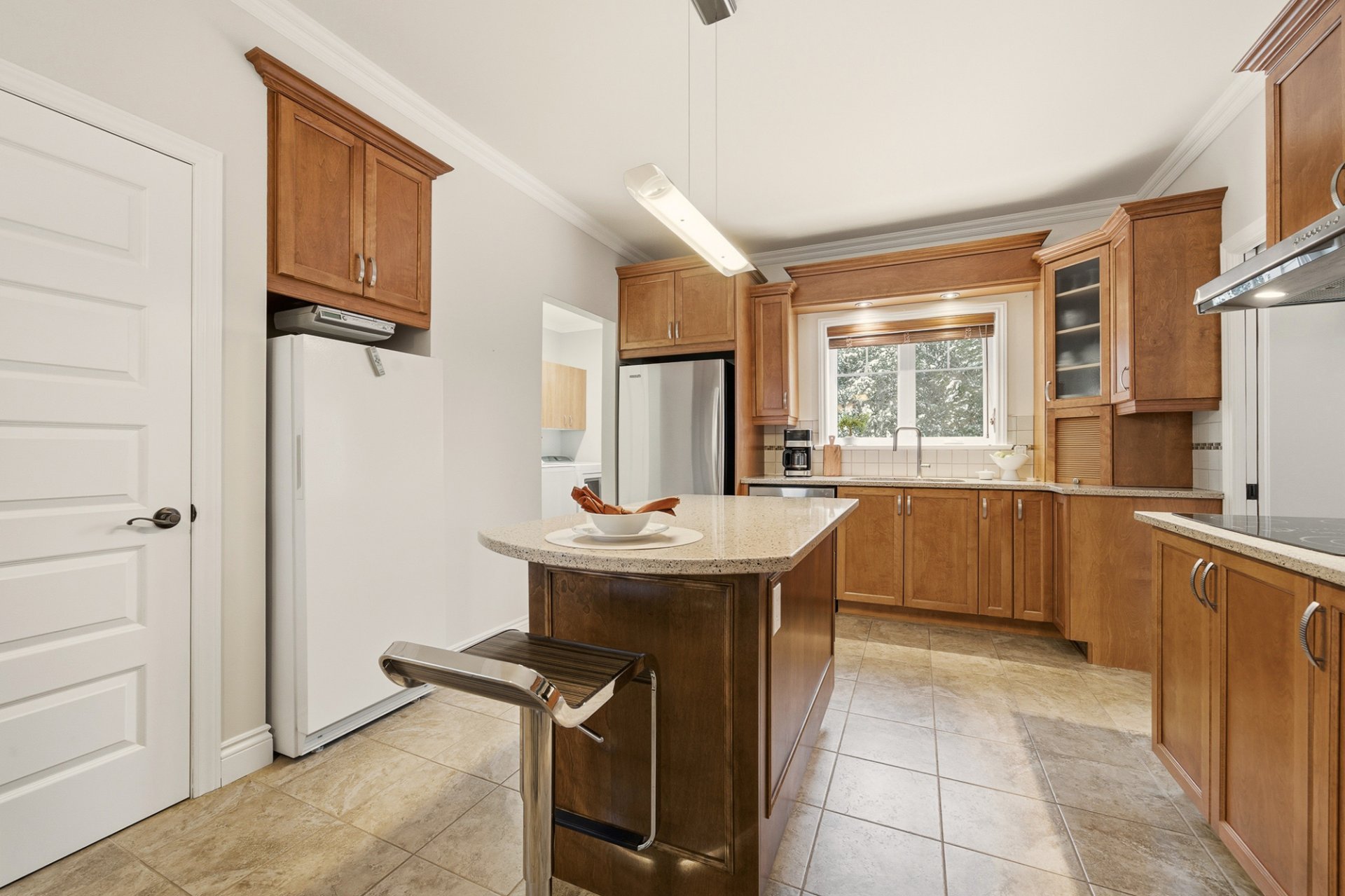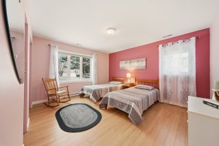 Le sous-sol entièrement aménagé dévoile une vaste salle familiale lumineuse avec poêle au bois, une cuisinette, une salle de bain et deux chambres à coucher, offrant une polyvalence remarquable.